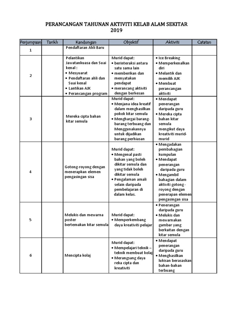 Perancangan Tahunan Aktiviti Kelab Alam Sekitar 2019 Pdf
